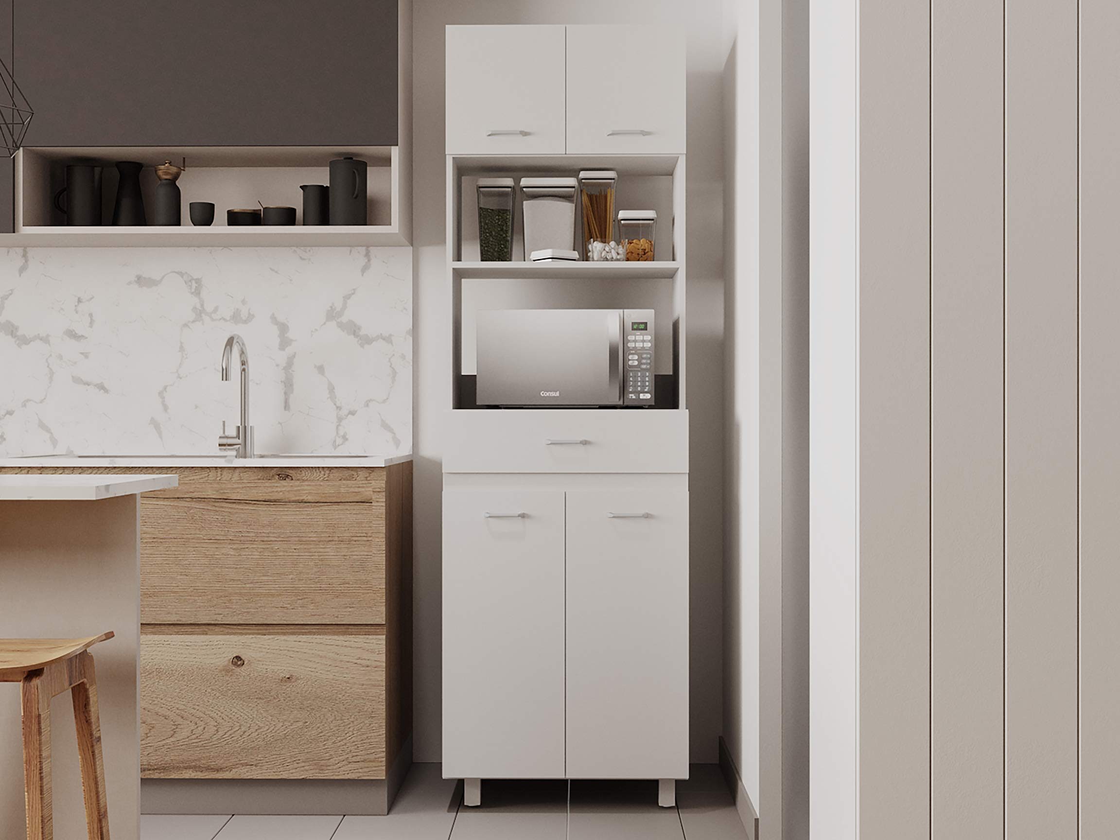 Si prefieres un mueble más cerrado para guardar tu microondas, este modelo es la opción perfecta para ti. Cuenta con puertas que ocultan el microondas y otros utensilios de cocina que desees guardar en su interior. Además, este mueble cuenta con un acabado de melamina resistente a los rasguños y a la humedad, lo que lo hace ideal para la cocina.