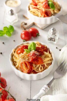 Puede ganar tiempo comenzando a cocer los tomates en el momento en que la pasta esté prácticamente acabada.
